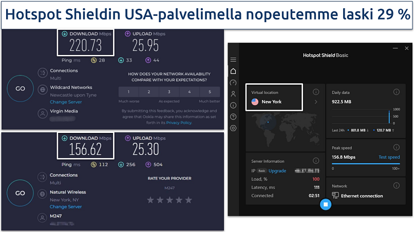 - Rajaton tiedonsiirto torrent-latauksiin. Hotspot Shield Basic toimii ilman datakattoa. Se on myös nopeampi kuin hide.me, minkä ansiosta kyseessä selkeästi parempi VPN-vaihtoehto torrent-latauksia varten.